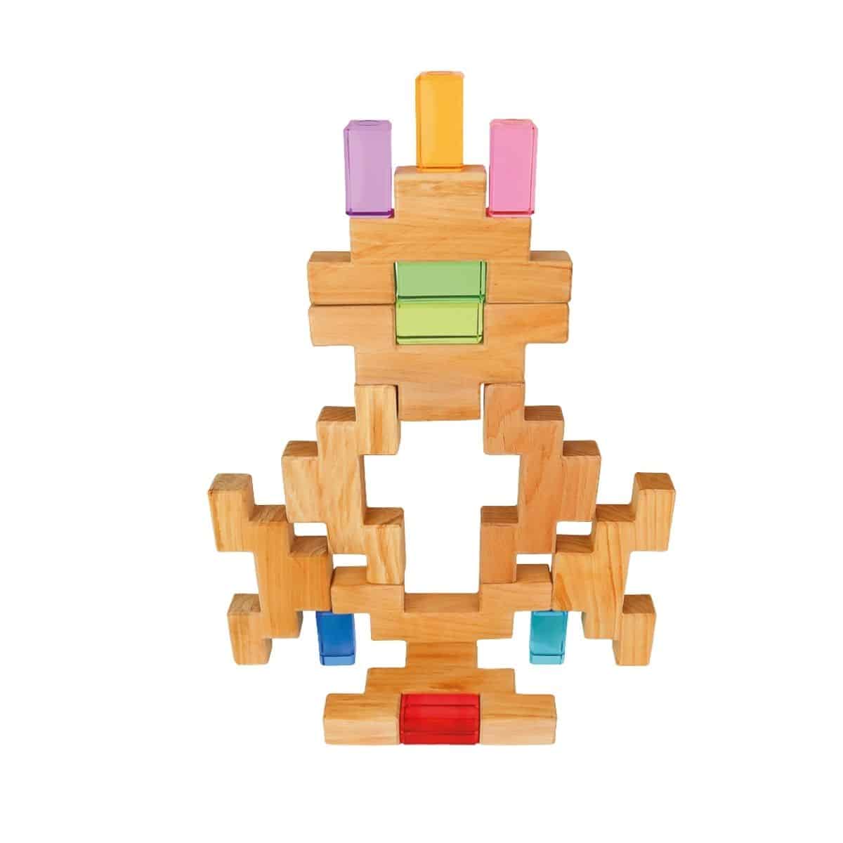 Die Bauspiel Holzklötze fördern freies Spiel, Fantasie und räumliches Denken. Kinder können Treppen, Türme und Bauwerke errichten und dabei spielerisch Formen, Balance und Statik entdecken.