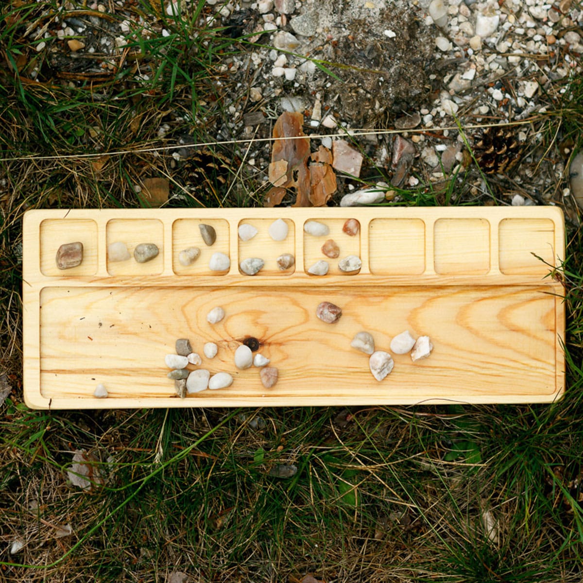 Ein Sinnestablett aus natürlichem Kiefernholz. Ein Raum, in dem Sie wunderschöne Mandalas mit natürlichen Elementen klassifizieren, sammeln oder erstellen können. Eine Einladung, nach draußen zu gehen und die Gegend zu erkunden.