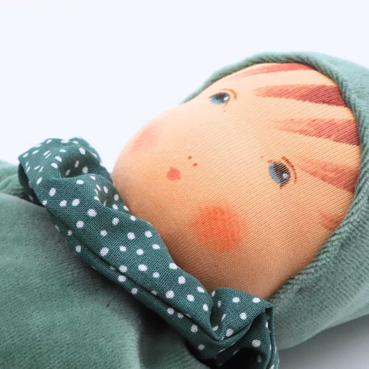 Der schlicht gehaltene Overall in warmem Türkistönen verleiht der Puppe ihren Namen und sorgt für eine natürliche, beruhigende Farbwirkung – ganz ohne künstliche Farbstoffe oder grelle Kontraste.