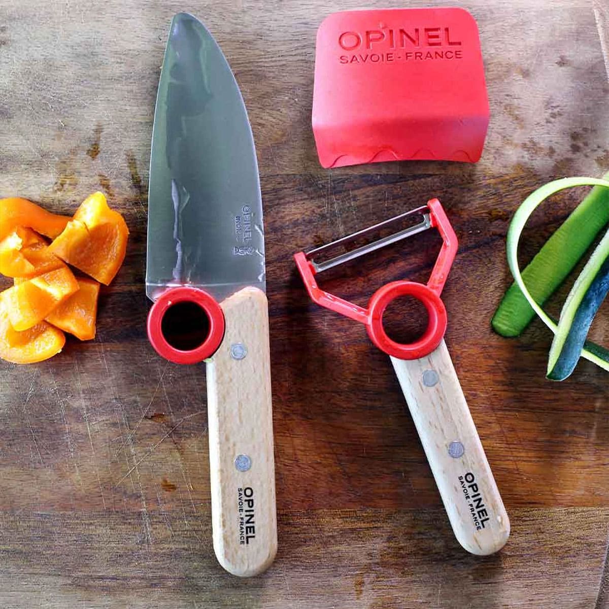 Das Kinder-Küchenmesserset „Le Petit Chef“ enthält ein Messer, einen Schäler und einen Fingerschutz in kräftigem Rot. Kinder kochen mit Opinel: Die Serie „Petit Chef” ist ideal, um Kindern das Kochen beizubringen. Der pädagogische Ring hilft, die Finger richtig anzulegen, während der Fingerschutz die Hand schützt, die das zu schneidende Lebensmittel hält.