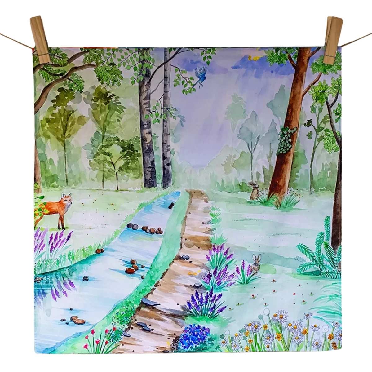 - Handillustriertes Spieltuch mit Waldlandschaft und Bach